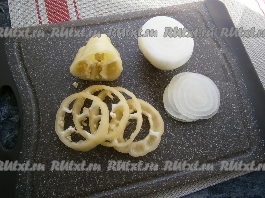 Болгарский перец нарезать тонкими кольцами, тонкими кружочками нарезать репчатый лук.