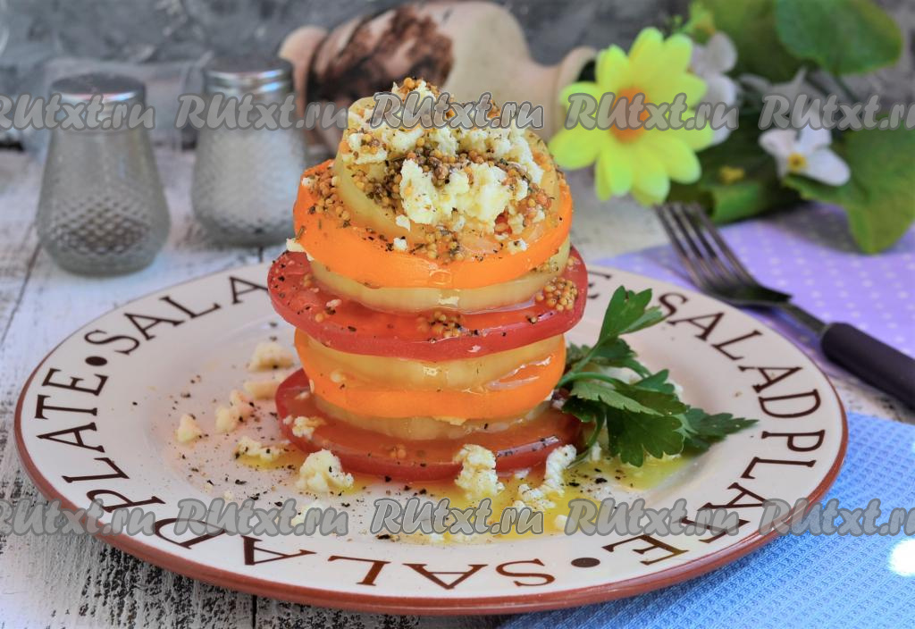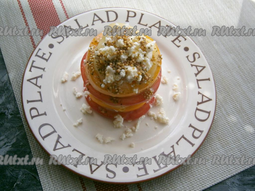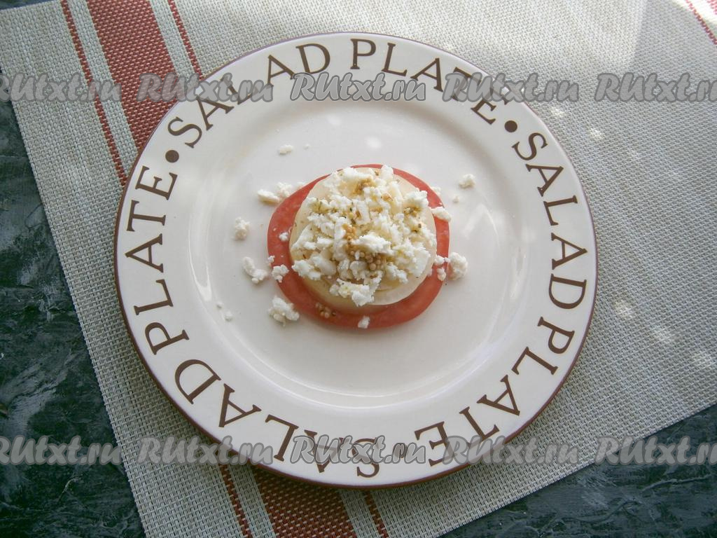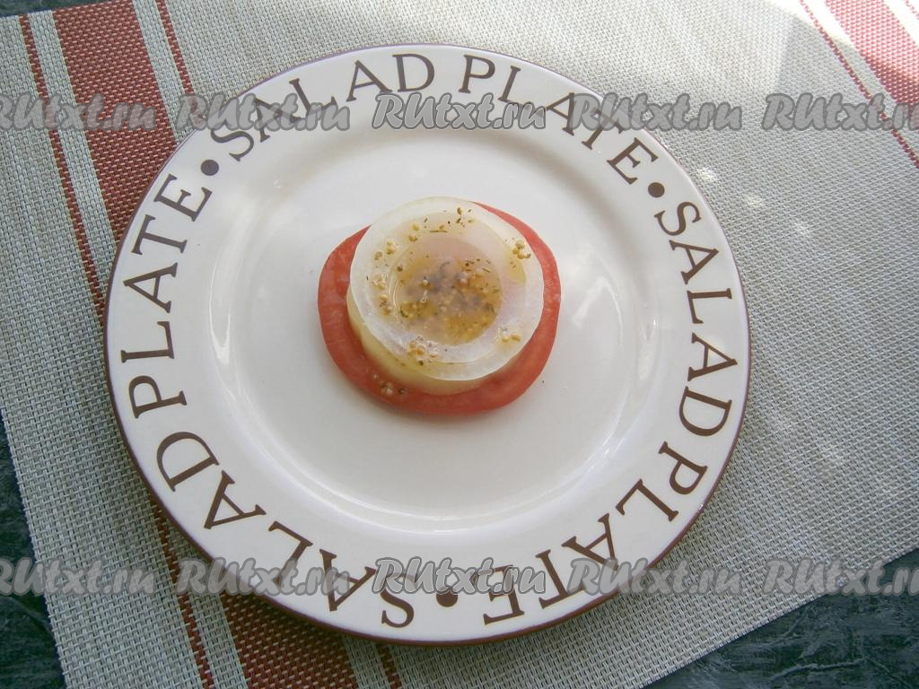 На плоскую круглую тарелку выкладывать салат в виде башенки: вначале - кружочек красного помидора, затем - колечко сладкого перца и кружочек лука, немного посолить, полить чуть заправкой.
