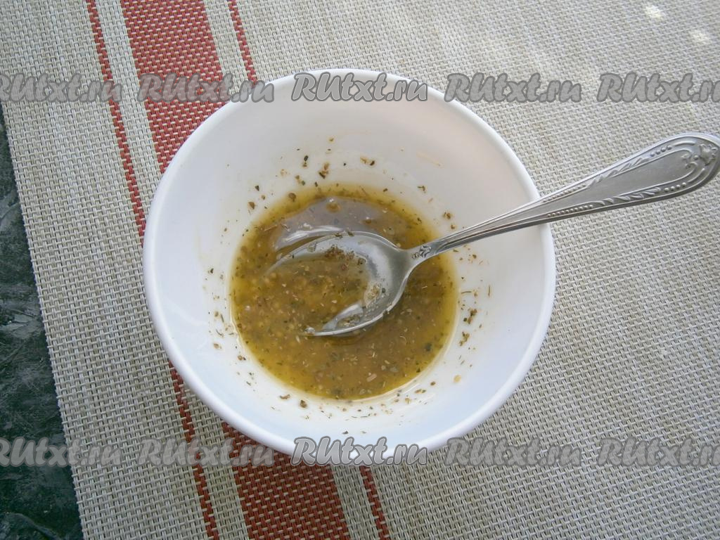 Приготовить заправку: к оливковому маслу добавить лимонный сок, французскую горчицу, сахар, кориандр и хмели-сунели.