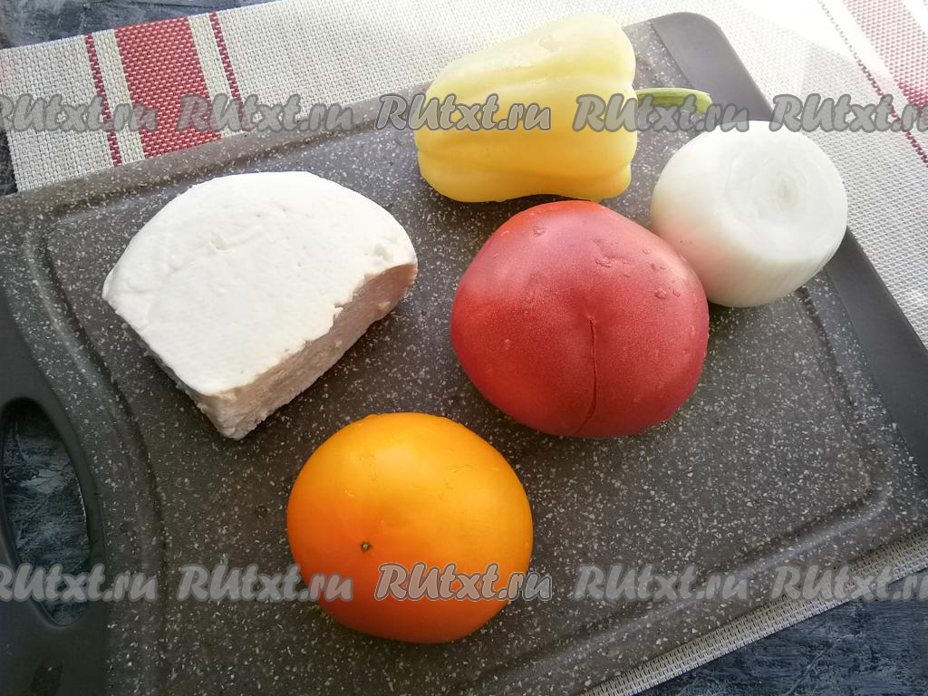 Половинку луковицы очистить. Помидоры вымыть и обсушить, из болгарского перца вынуть семена.