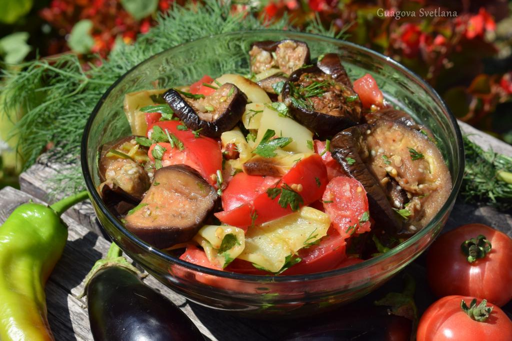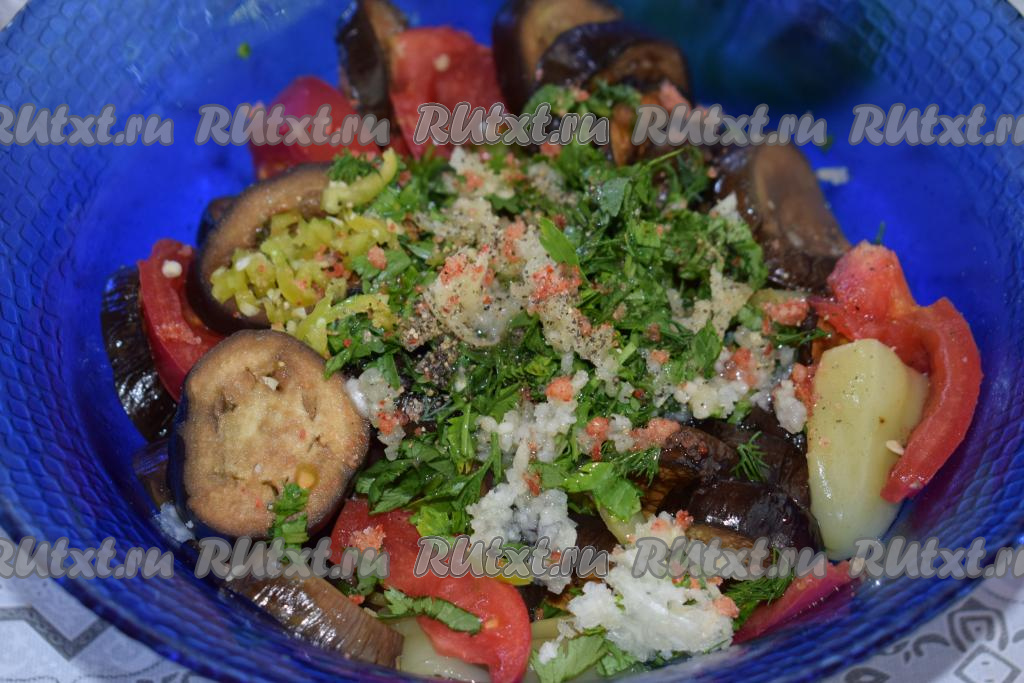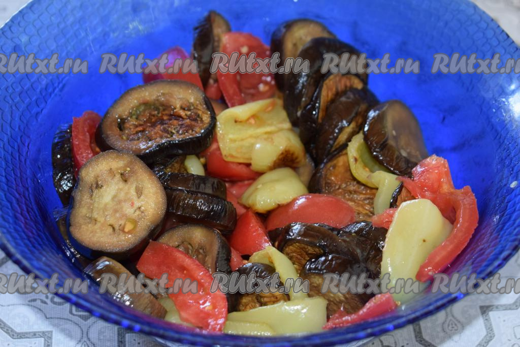 Далее к помидорам добавляем наши запечённые баклажаны и перцы.