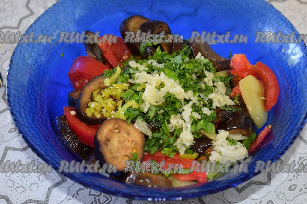 Чеснок чистим от кожицы и пропускаем через чеснокодавку, острый перец нарезаем мелко. В салатник с баклажанами, помидорами и перцем добавляем зелень, чеснок и острый перец.
