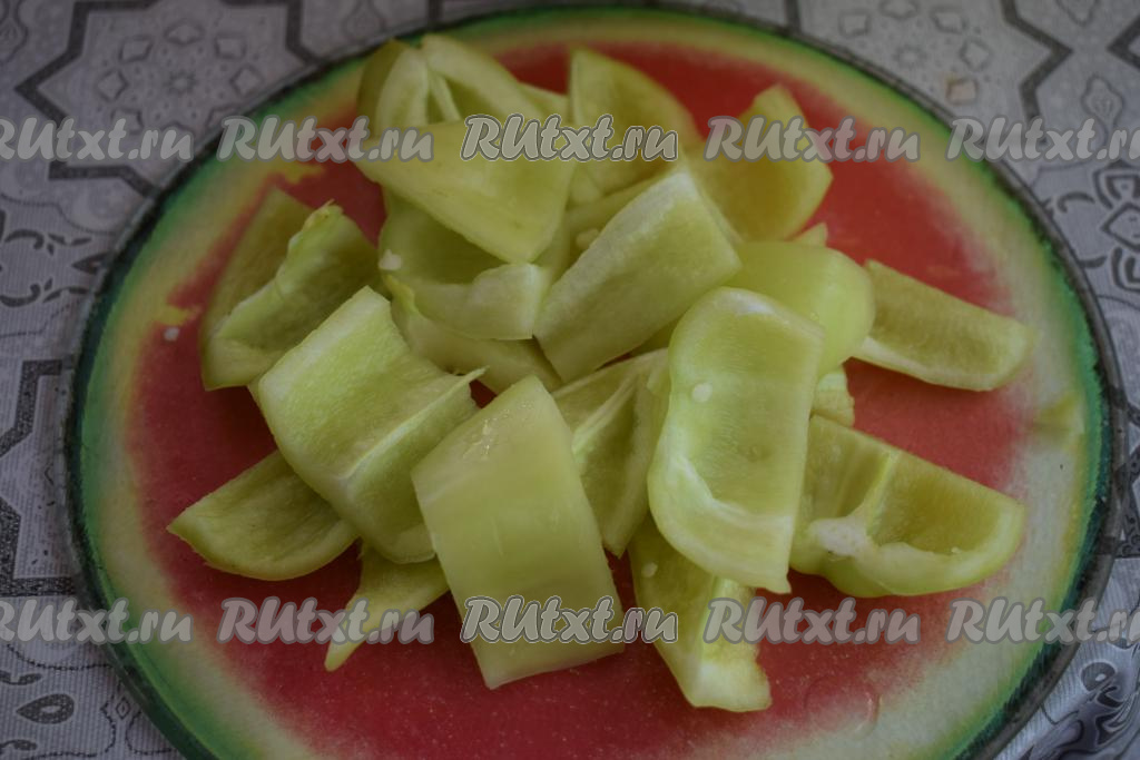 Болгарский перец нарезаем на кусочки среднего размера.