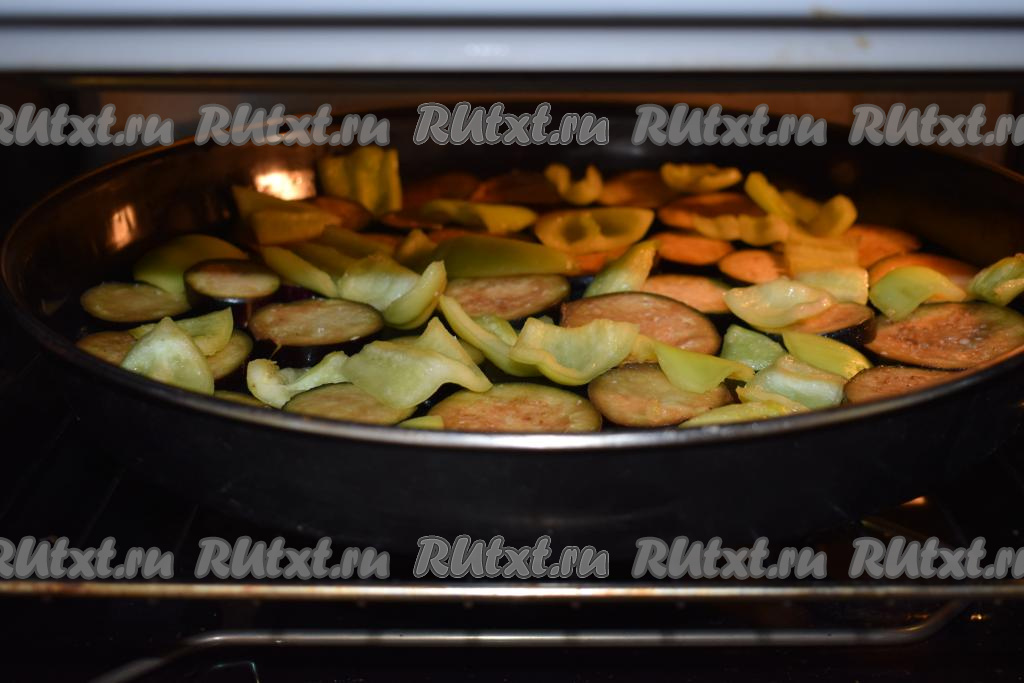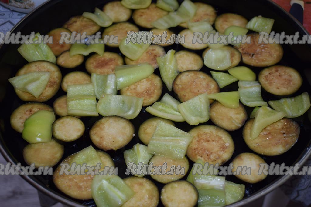 Выкладываем баклажаны и перец на противень.