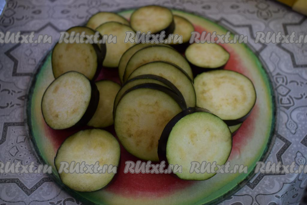 Нарезаем баклажаны на кружочки толщиной, примерно, 0,8 см.