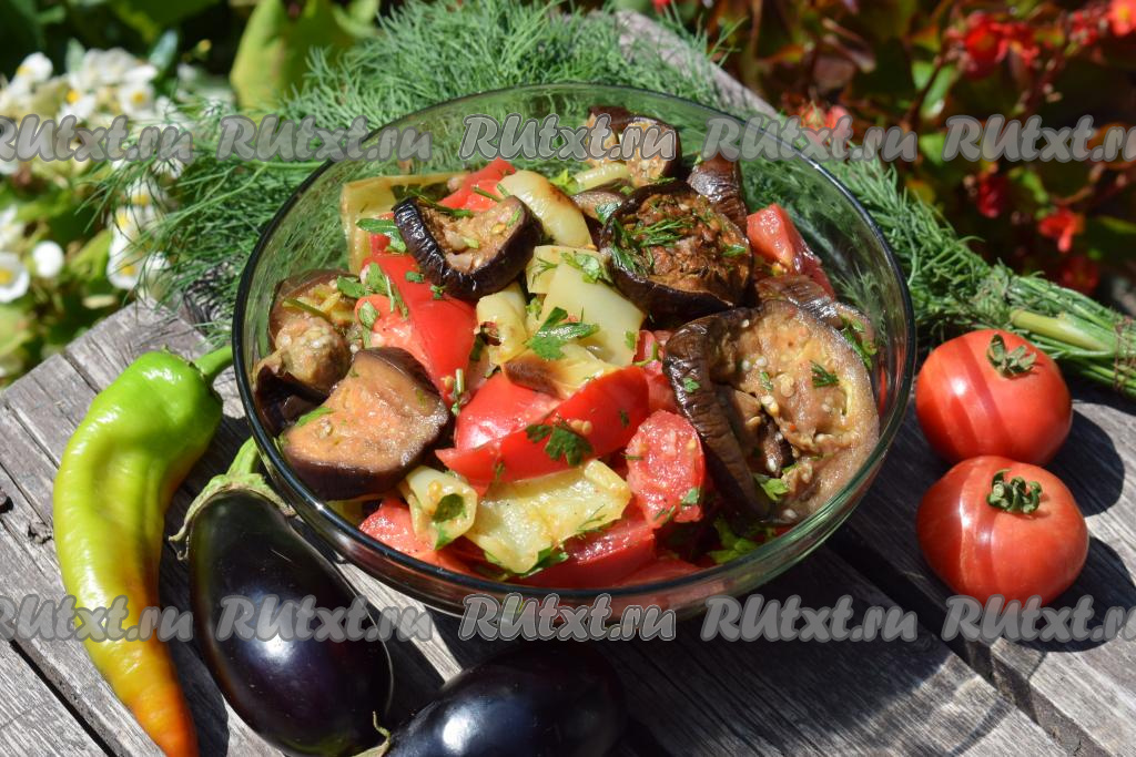 Наш замечательный салат с помидорами, печёными баклажанами и перцем готов. Он получается очень сочным, насыщенным, ароматным, остреньким и таким вкусным!