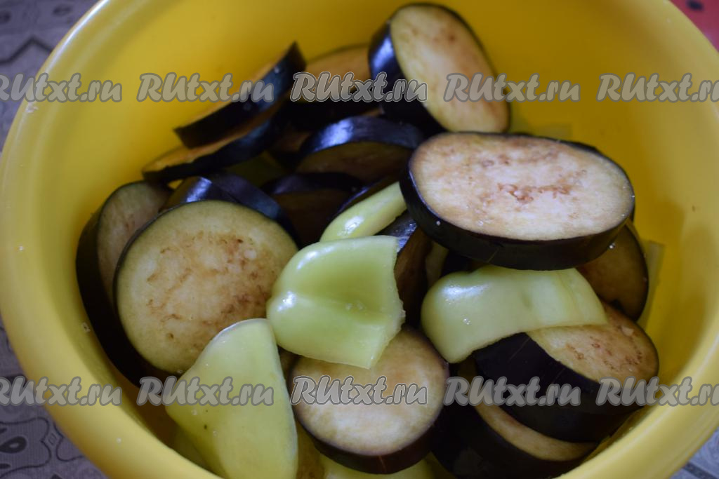 Складываем в глубокую миску нарезанные баклажаны и болгарский перец, солим их по вкусу и даём постоять, примерно, 10 минут. Баклажаны дадут сок, который по прошествии времени надо будет слить.