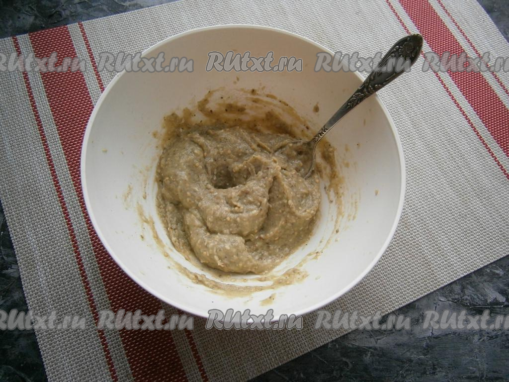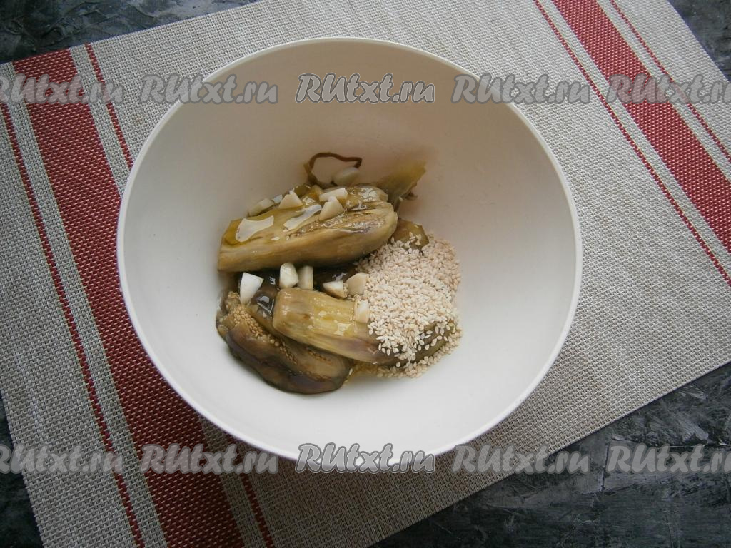Поместить мякоть баклажанов в миску (или чашу блендера), добавить кусочки чеснока, всыпать кунжут.