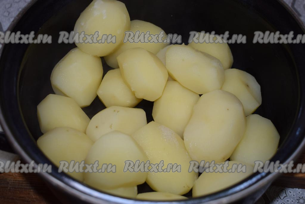 В это время очистить картофель и отварить его в подсоленной воде в течение минут 15 с момента закипания, затем воду слить.