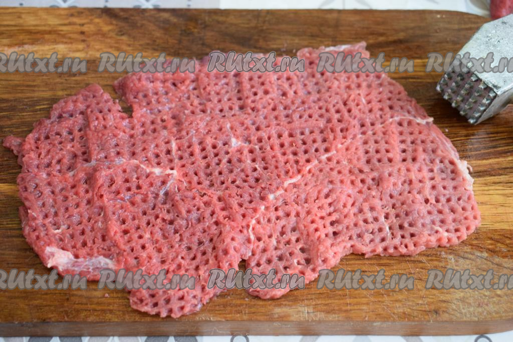 Молоточком отбить кусочки говядины с двух сторон.