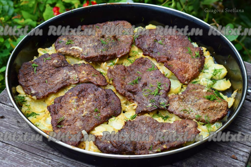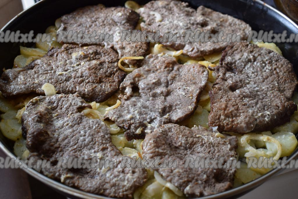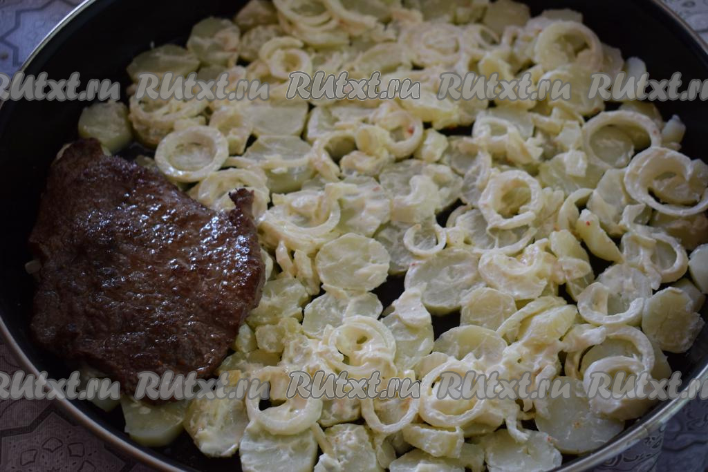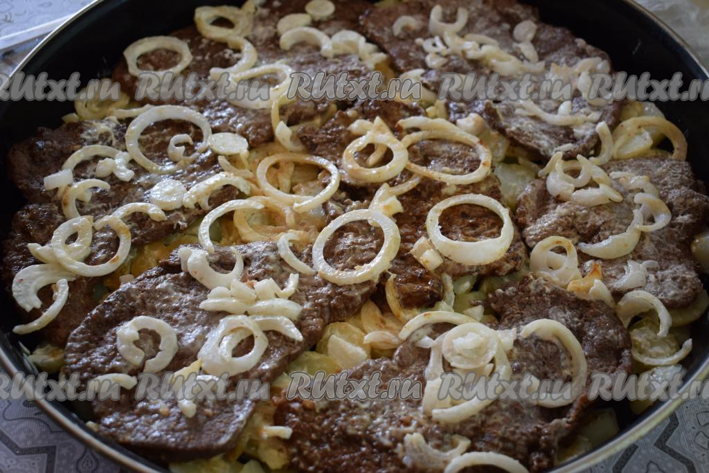 Таким образом поверх картошки с луком выкладываем в один слой все обжаренные отбивные из говядины.