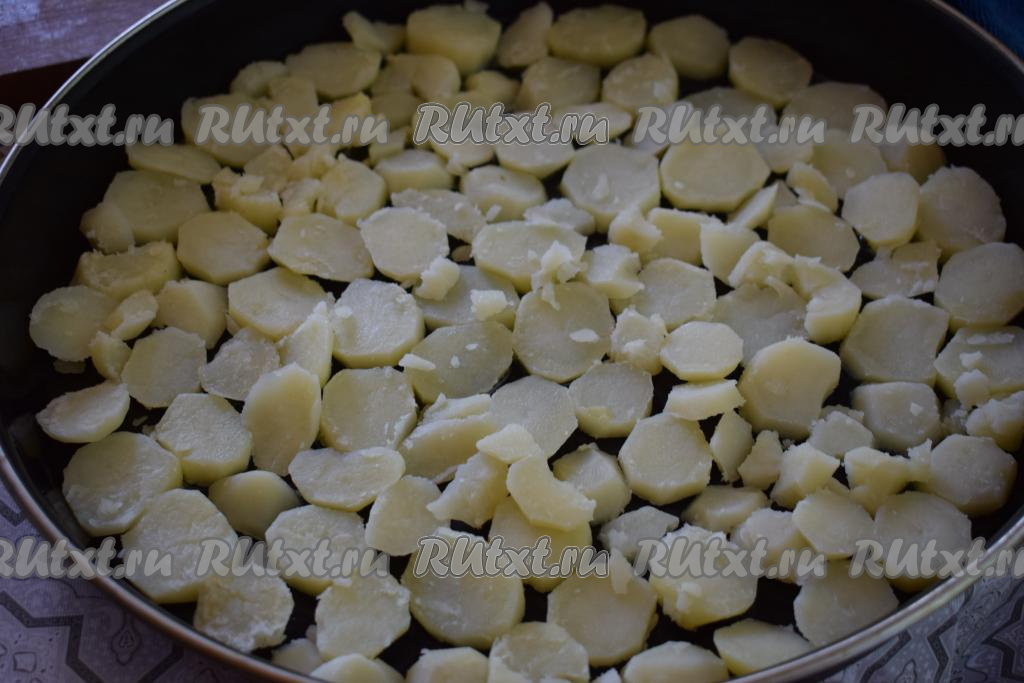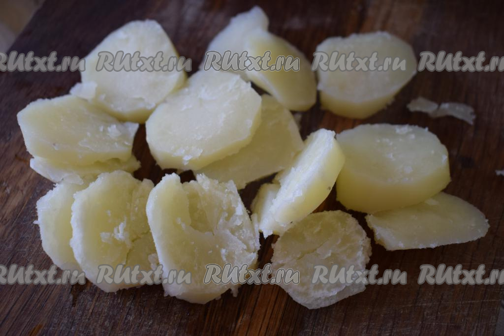 Отваренный картофель нарезать на кружочки.