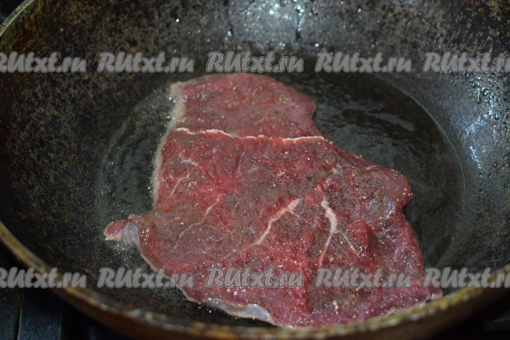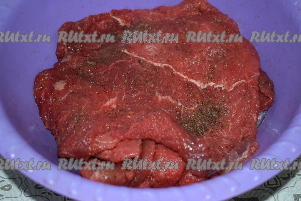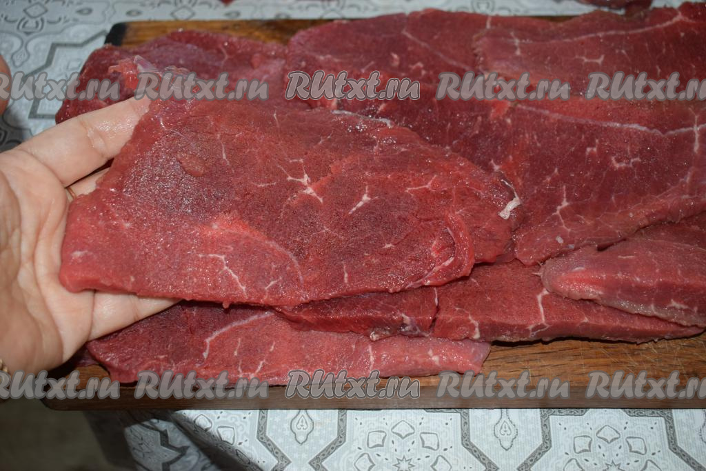 Мякоть говядины без кости нарезать на порционные кусочки-пласты, как для отбивных.