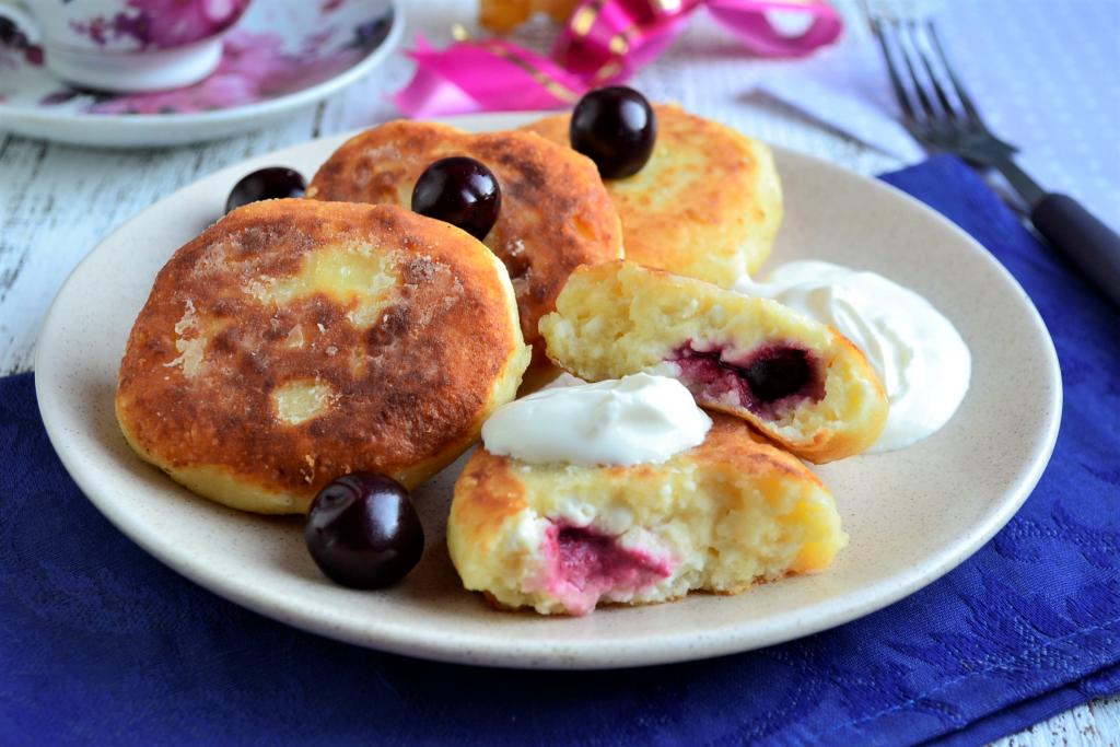 Хороши сырники, приготовленные из творога с вишней, и в горячем, и в охлаждённом виде. Подавайте их со сметаной и сахаром, вареньем, джемом или мёдом.