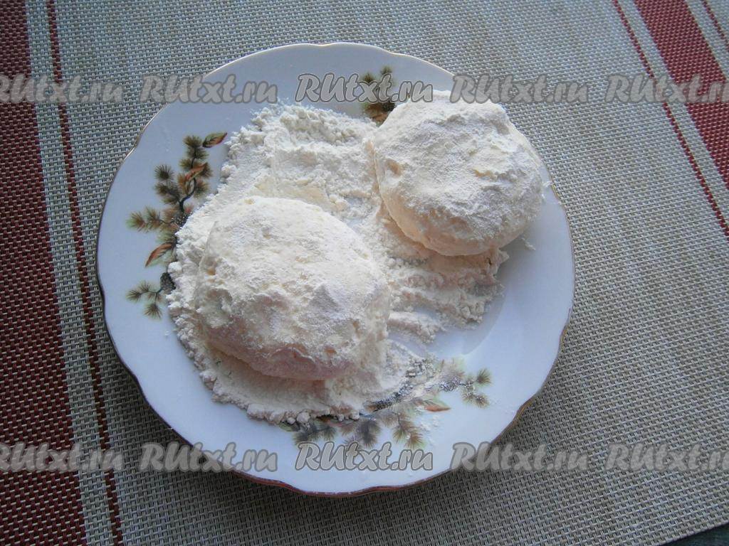 И теперь сформировать колобок (шарик), который совсем немного придавить (не перестарайтесь, чтобы сок вишни не выделился сверху творожного сырника). Сырники обвалять со всех сторон в муке.