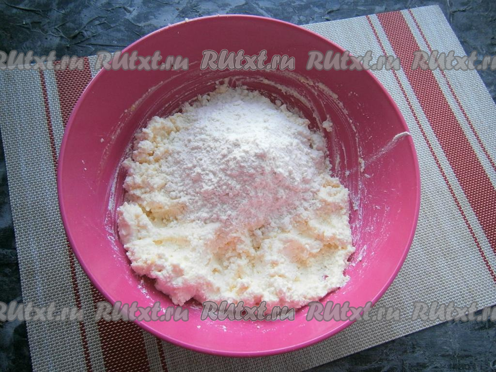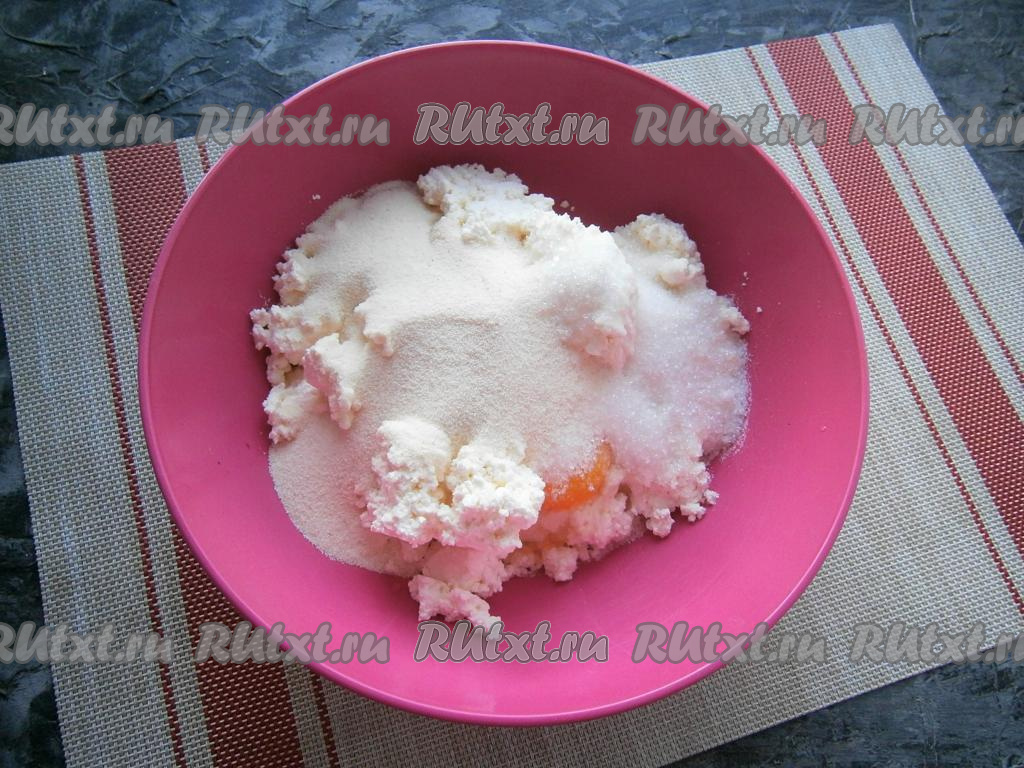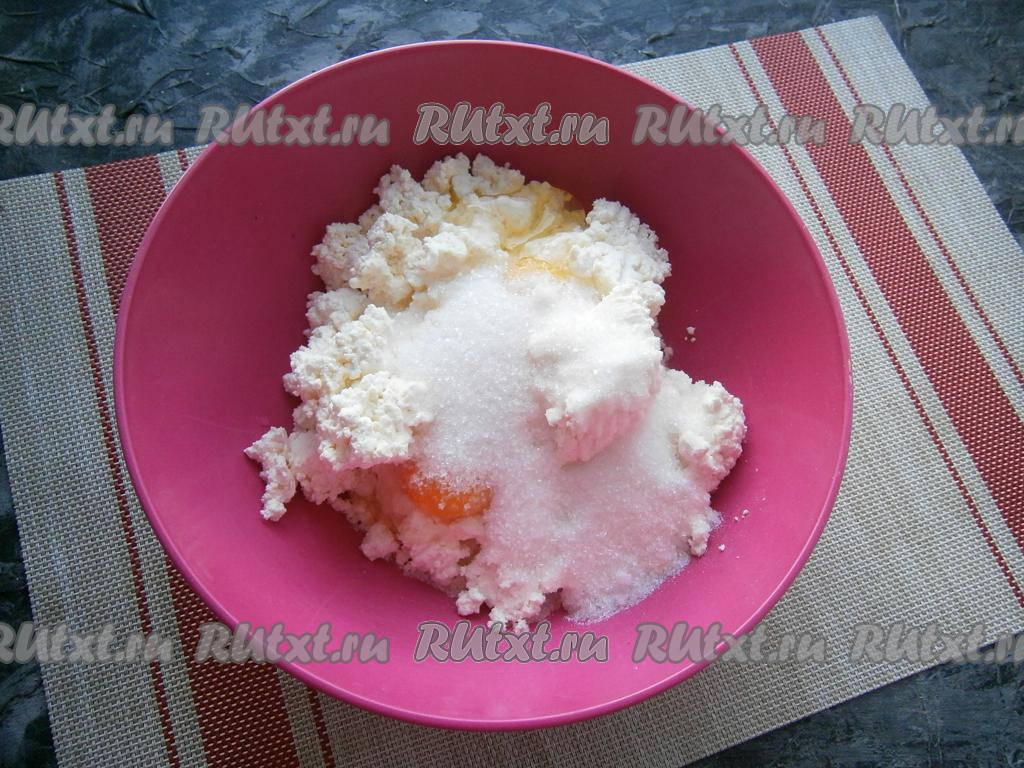 В творог, который не должен быть слишком влажным, добавить 2 яйца, всыпать сахар, соль и ванильный сахар.