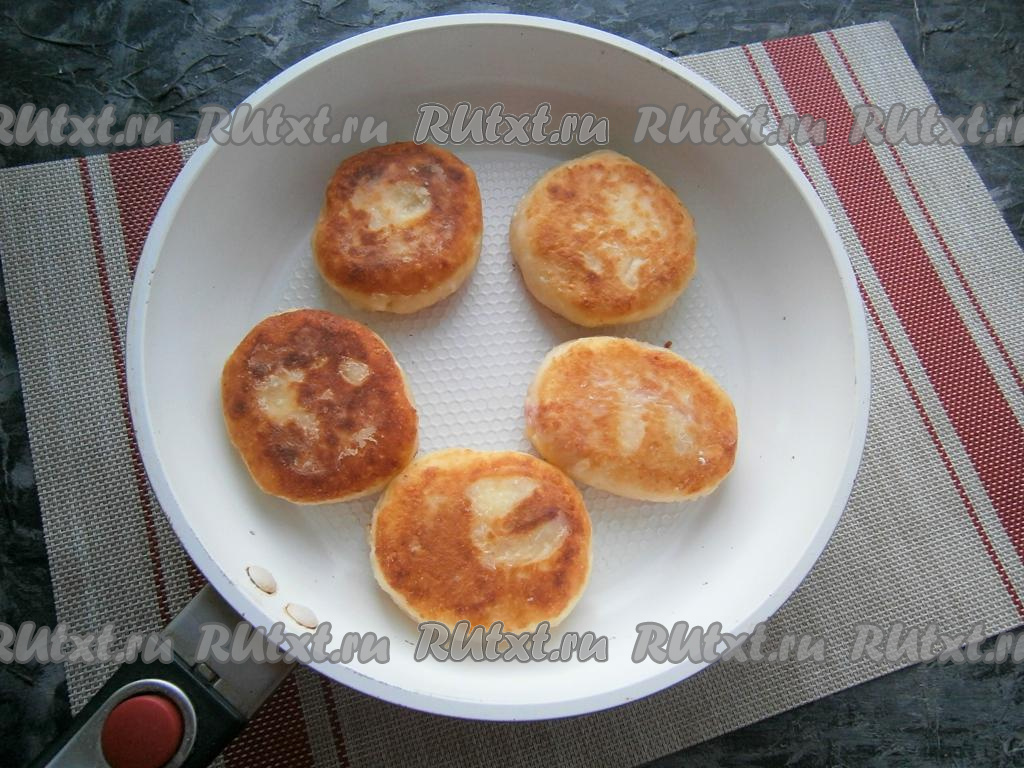 Сковороду разогреть с растительным маслом, выложить подготовленные сырники. Жарить их на небольшом огне до румяности с двух сторон (по 3-4 минуты с каждой стороны). Сырники отлично прожариваются!
