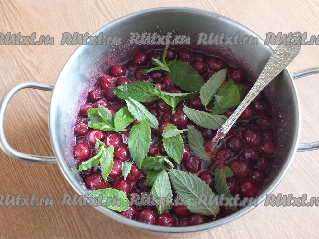 В закипевшую вишню с сахаром, добавьте чистые листики мяты, перемешайте. Варите на медленном огне 15 минут, периодически аккуратно перемешивая. Затем, убрав с огня, дайте настояться варенью 6-8 часов под закрытой крышкой.