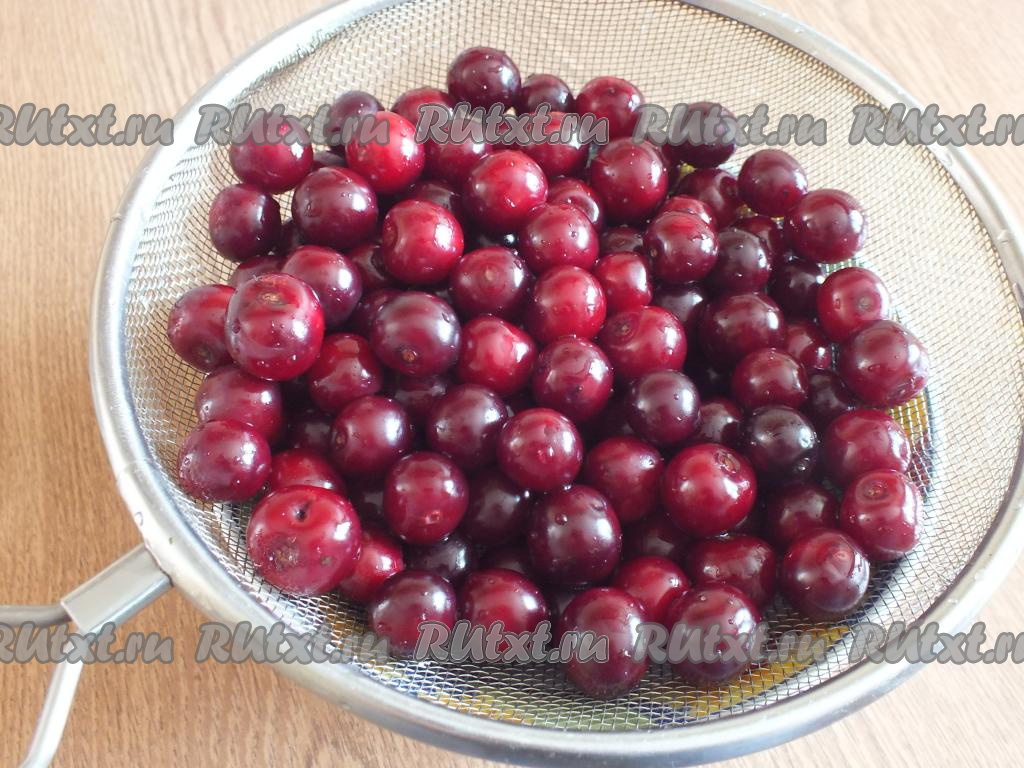 Подготовьте вишню. Ягоды вымойте под проточной водой. Откиньте на дуршлаг, чтобы стекла жидкость.