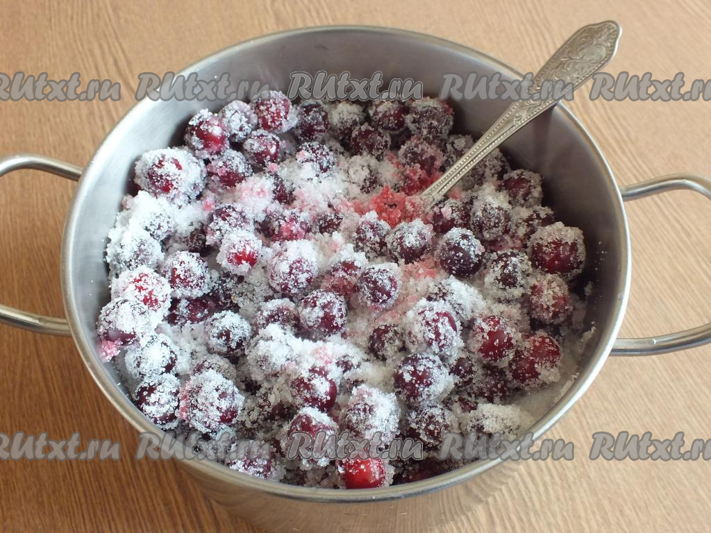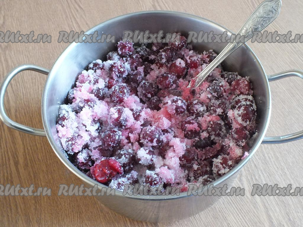 Вишню переложите в просторную кастрюлю с толстым дном, засыпьте ягоды сахаром, перемешайте и оставьте на 1-3 часа при комнатной температуре.