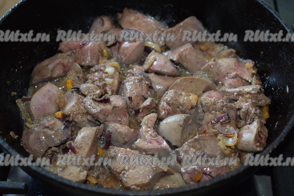 Жарим печень на среднем огне, достаточно часто помешивая, примерно, 10-12 минут (до того момента, пока на кусочках не перестанет выделяться сукровица и они станут однородного сероватого цвета).