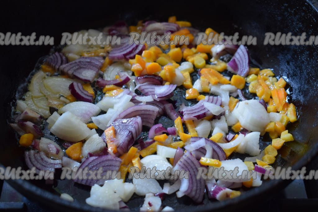 Отправляем в разогретую сковороду лук и морковь, жарим на среднем огне, иногда помешивая, до прозрачности овощей (примерно, 7-8 минут).