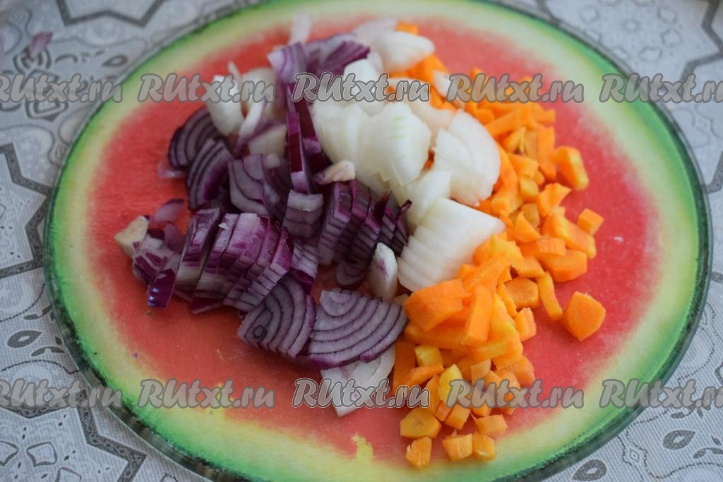 Очистим лук и морковь от кожицы. Нарежем морковь на кубики, а лук - на четверть кольца.