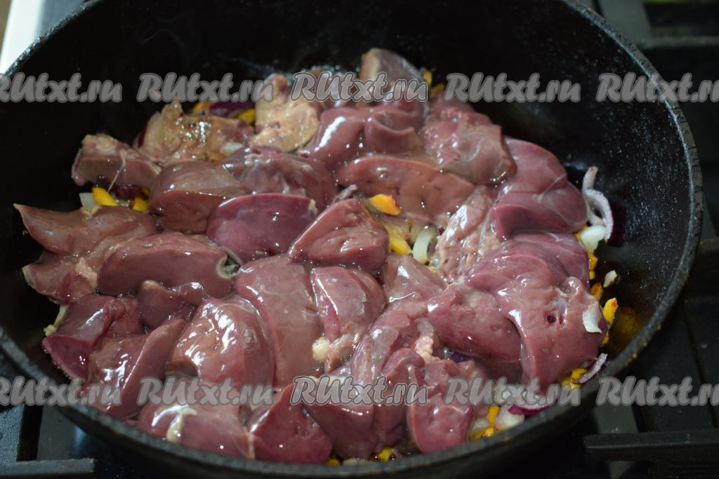 К обжаренным овощам выкладываем кусочки печени, солим и добавляем любимые специи.
