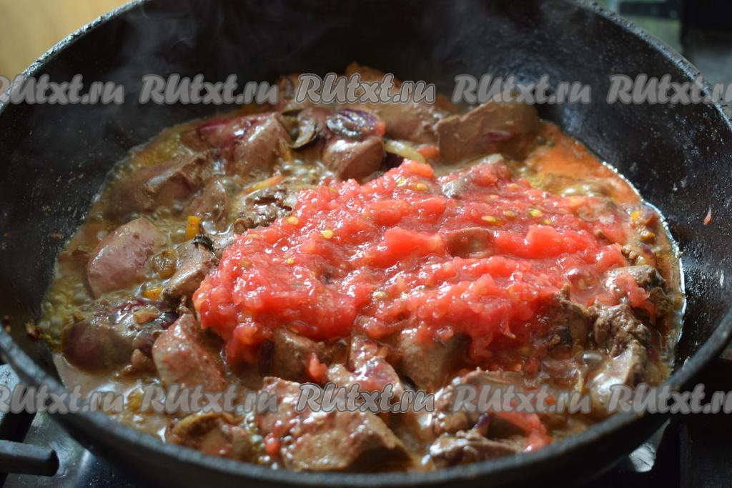 Далее в сковороду добавляем натёртые на тёрке помидоры.