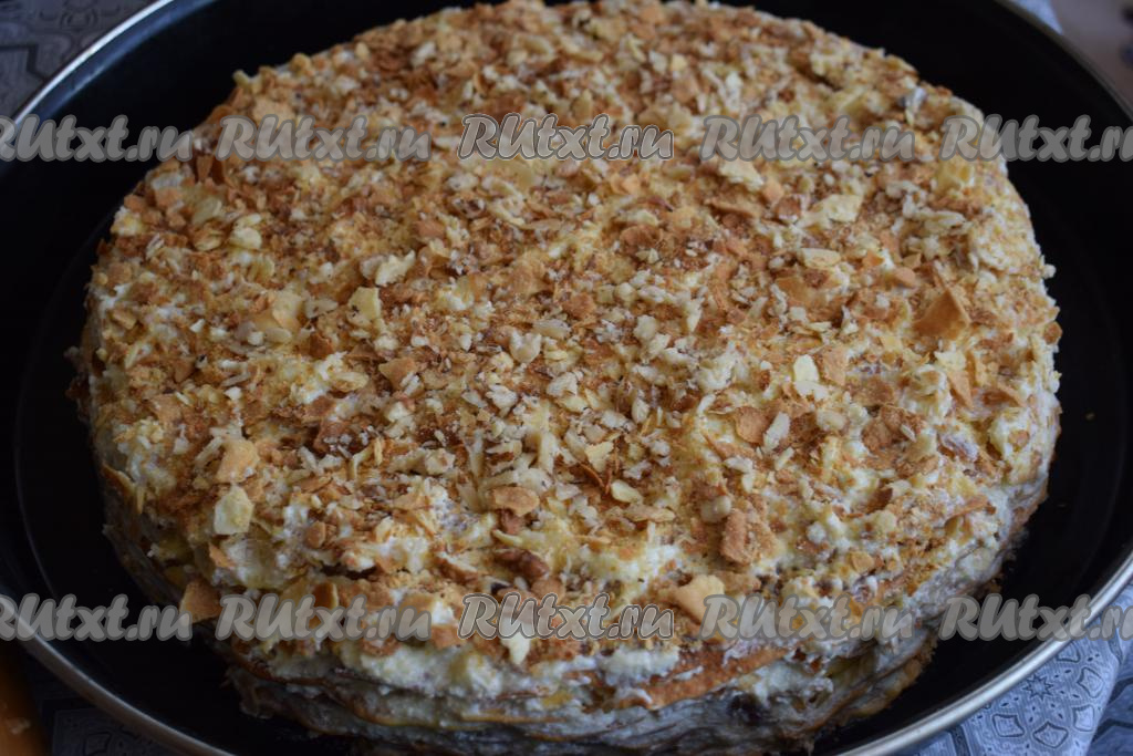 Корж для посыпки измельчаем скалкой и посыпаем им верхний корж, смазанный кремом.