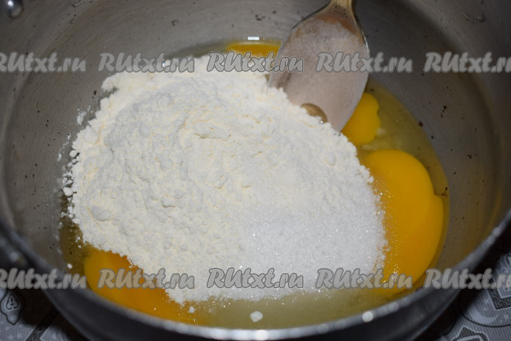 Готовим два крема. Сначала заварной, так как ему надо будет полностью остыть. Крем можно приготовить и накануне вечером. В алюминиевой кастрюле (это важно (!), в эмалированной кастрюле крем может подгореть) смешиваем яйца, сахар, ванилин и муку.