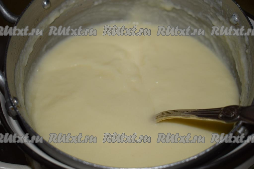 Отправляем кастрюлю на медленный огонь, доводим до кипения, постоянно перемешивая, а затем варим крем, непрерывно помешивая, примерно, 1-2 минуты. Когда крем начнёт густеть, выключаем огонь и добавляем к нему сливочное масло. Перемешиваем крем ложкой до растворения масла. Затем накрываем крем плёнкой в контакт, чтобы не образовалась корочка, и даём ему полностью остыть.