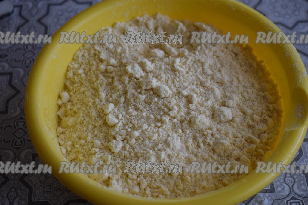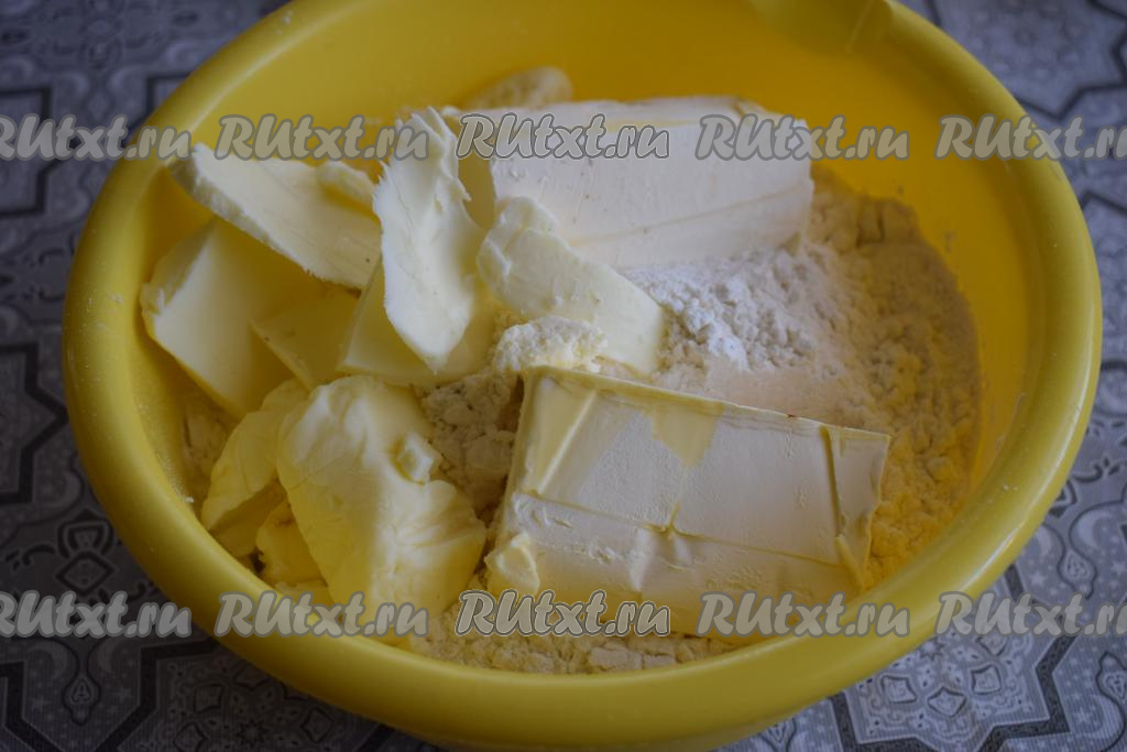 Рубим ножом масло и маргарин с мукой до получения лёгкой крошки.