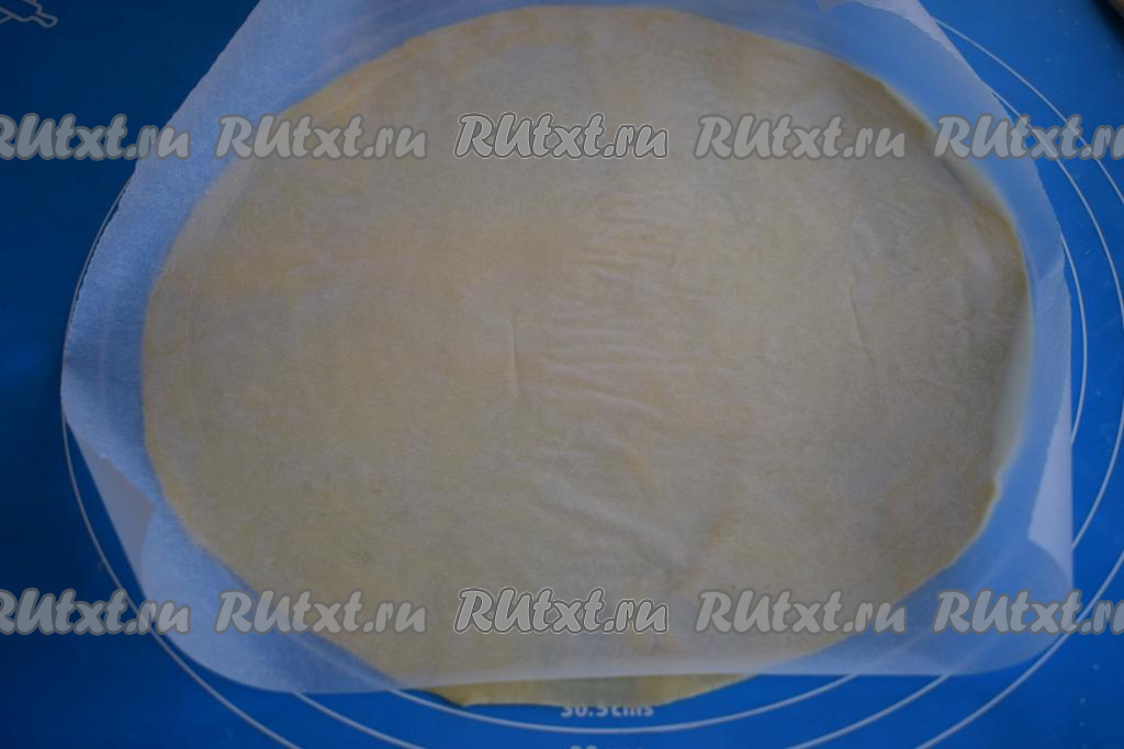 Раскатываем заготовку на столе, припылённом мукой в круг диаметром 28 см. Обрезаем края, используя тарелку (или крышку) нужного диаметра.