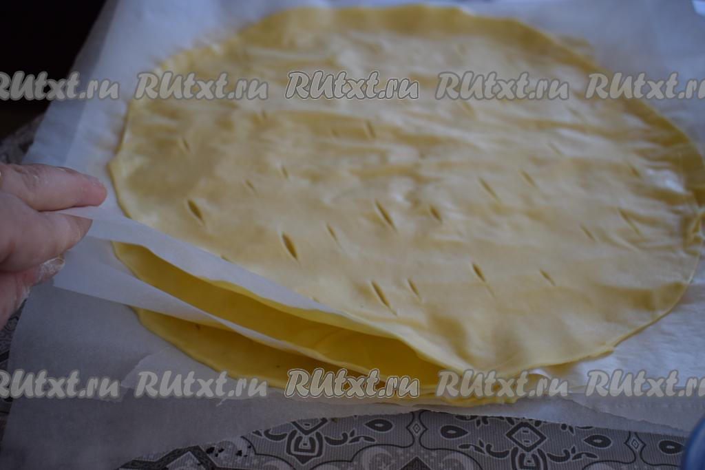 Таким образом я раскатываю все коржи и стопочкой складываю их друг на друга. Такой способ очень экономит время приготовления и место на рабочем столе.