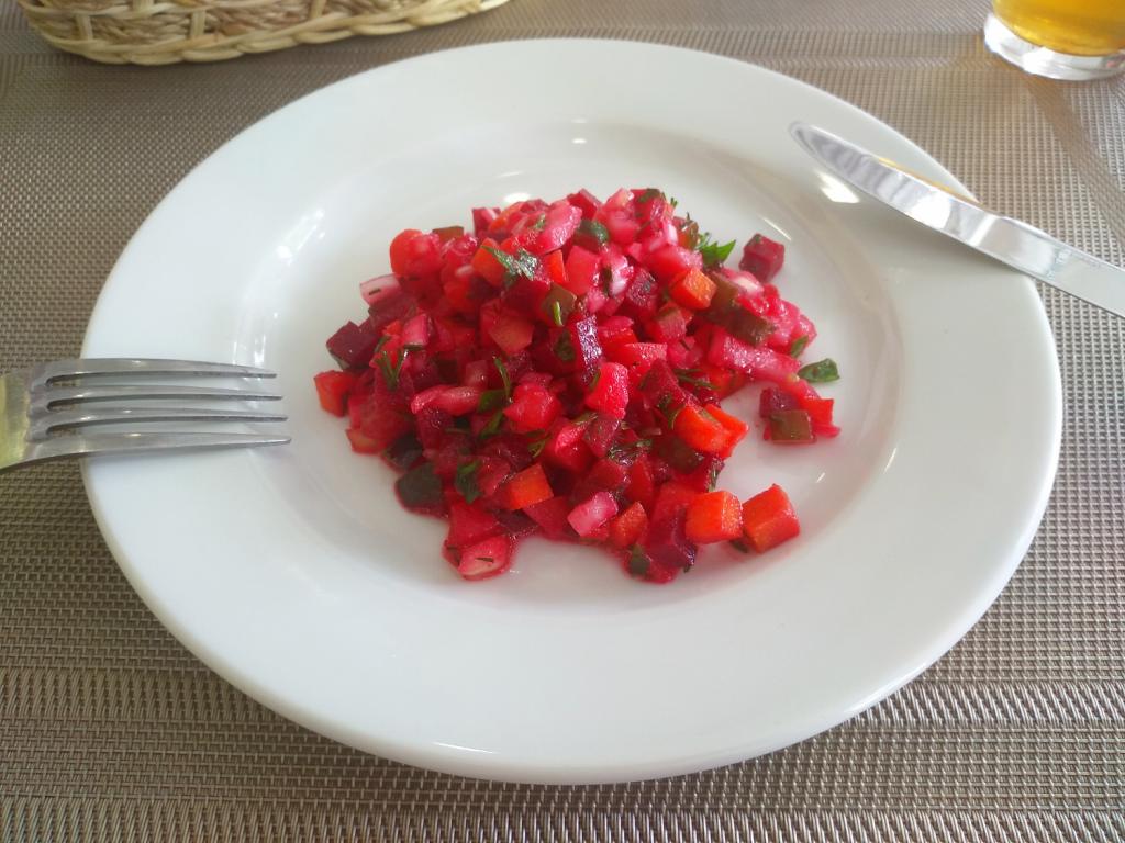 У летнего винегрета незабываемый вкус со множеством ароматов свежих трав и овощей (свежий огурчик, молодая морковочка, картошка и свеколка, зелень). Блюдо можно подать как самостоятельное (постное) или использовать как гарнир.