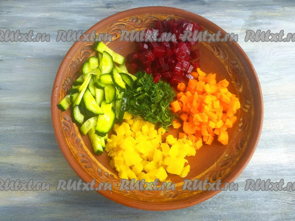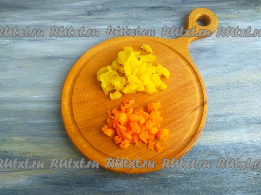 Варёные картофель, морковь и свеклу остудить, очистить от кожуры. Нарезать картошку и морковь мелкими кубиками (я нарезала с помощью сетки для резки овощей).