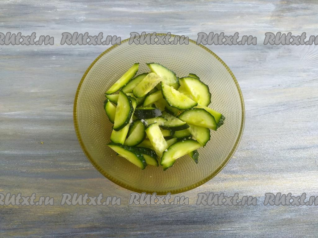 Свежий огурец нарезать небольшими ломтиками, посолить и оставить на 5-10 минут для удаления излишков сока.