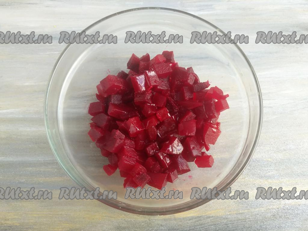 Отварную свеклу нарезать кубиками размером по 0,5 см, а затем выложить в отдельную миску, добавить чайную ложку растительного масла, перемешать.
