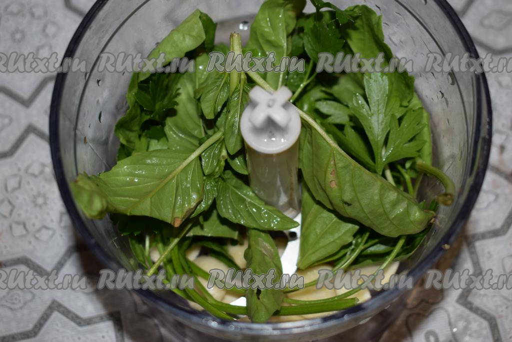 В это время базилик, петрушку и зубчики чеснока отправляем в блендер.