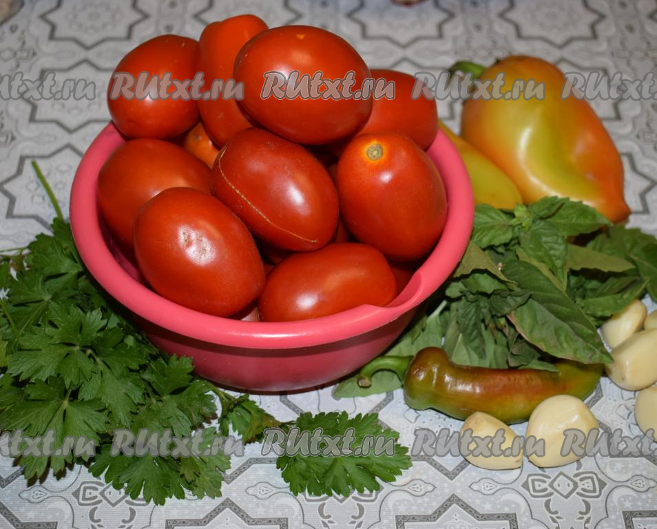 Подготовим продукты для приготовления томатного соуса на зиму. Помидоры вымоем, из болгарского перца удалим семена и плодоножки. Чеснок очистим, вымоем острый перец, петрушку и базилик.