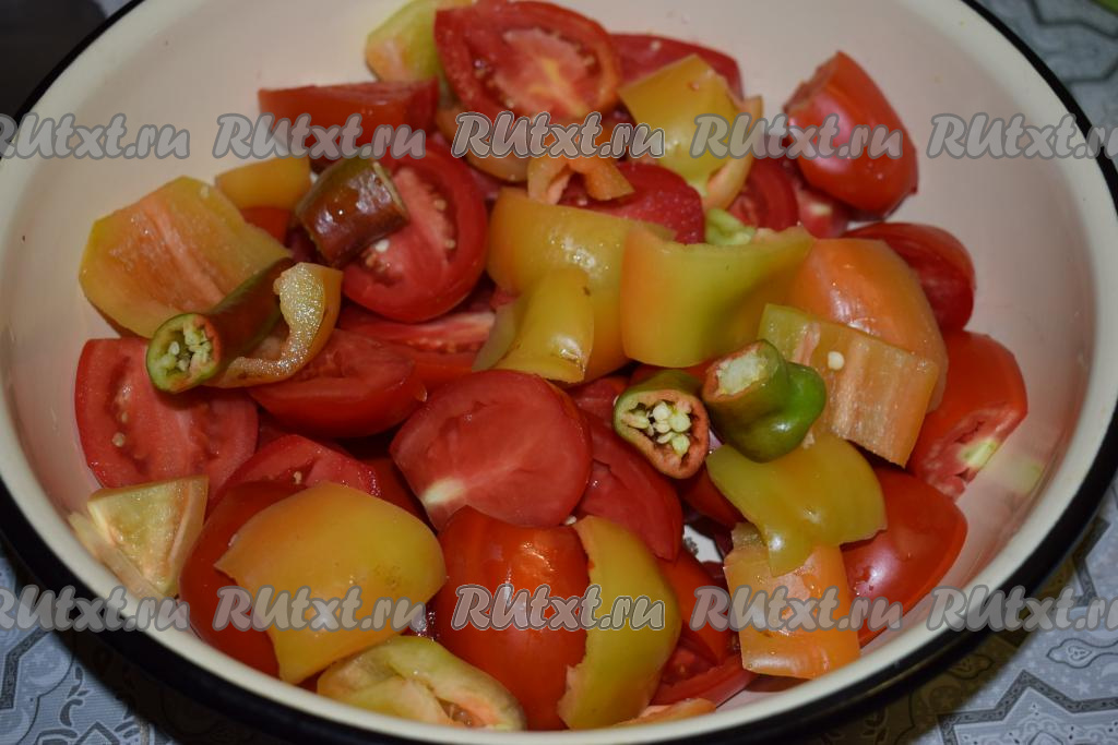 Нарежем помидоры на половинки, болгарский и острый перец (семена из острого перца я не удаляла) - на кусочки.