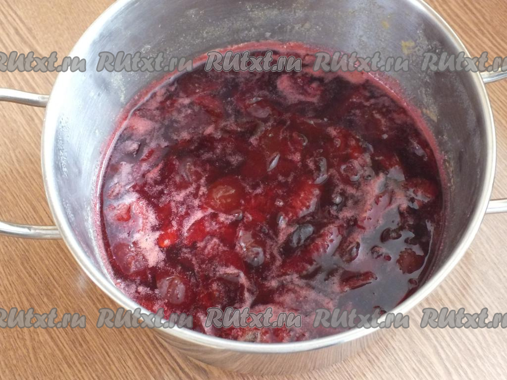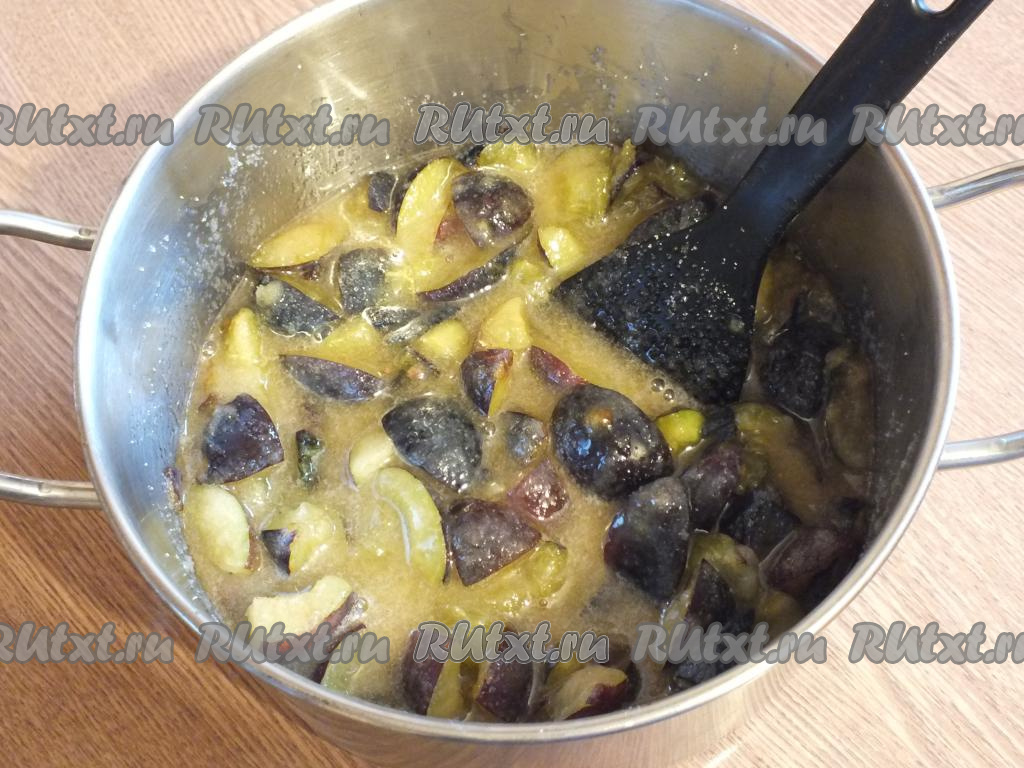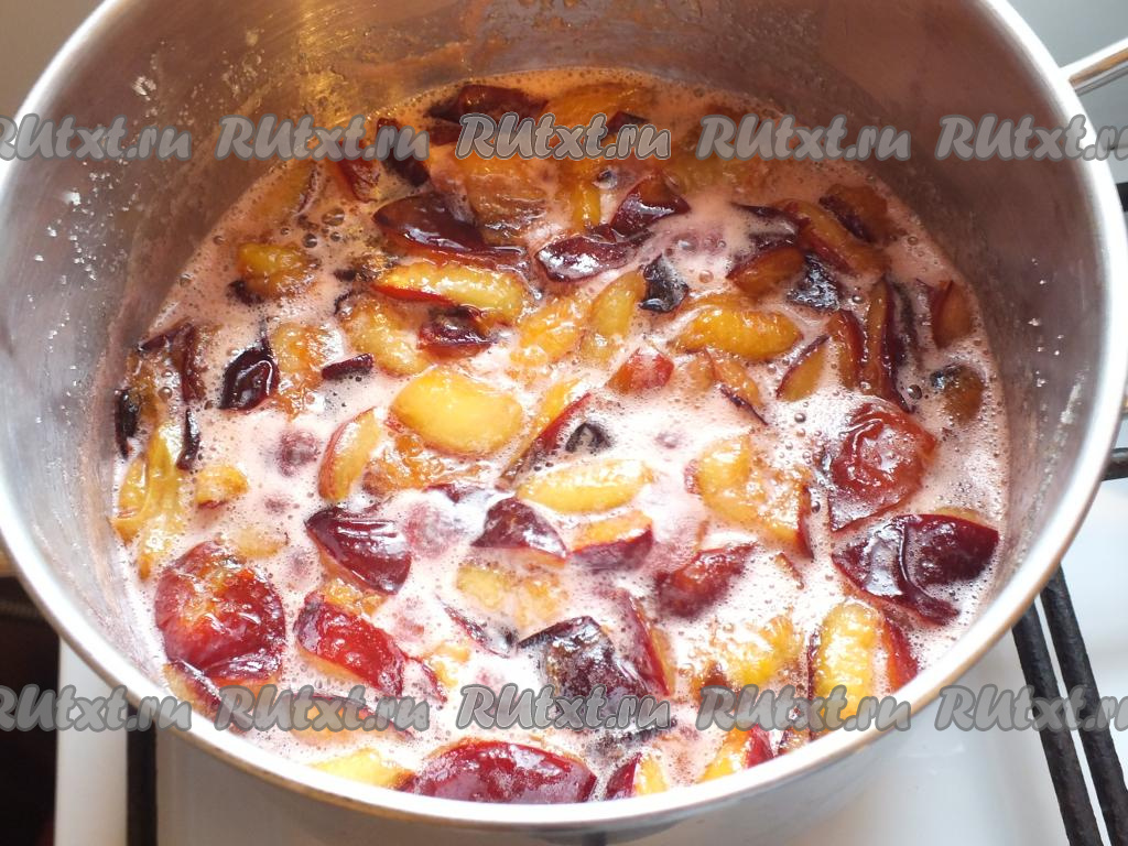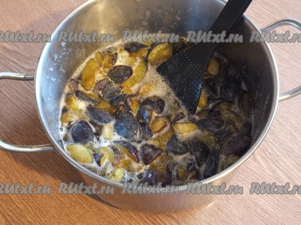 По истечении времени поставьте кастрюлю со сливами на минимальный огонь, нагревайте до закипания, а затем варите 15 минут, снимая пену и время от времени перемешивая.