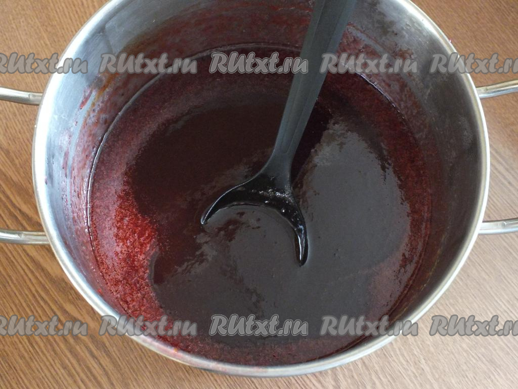 Верните кастрюлю на огонь, включите умеренный огонь и нагревайте. После закипания, варите сливовый джем, помешивая, в течение 15 минут на небольшом огне. За это время джем заметно начнёт темнеть. И если по дну кастрюли провести ложкой (или лопаткой), то там масса будет более густой. Это говорит о том, что джем можно снимать с огня.
