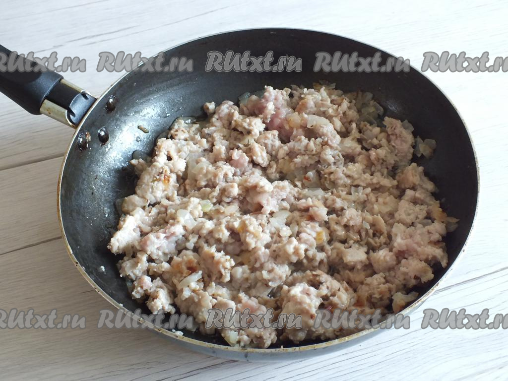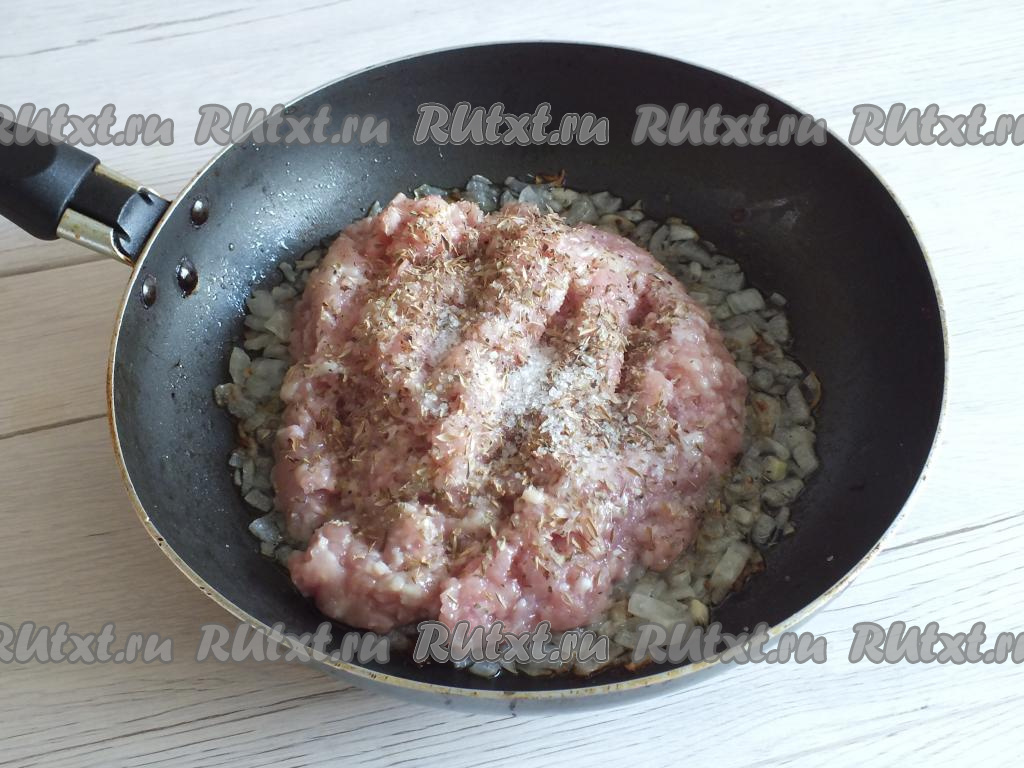 Когда лук станет мягким, выложите фарш. Хорошо его разомните лопаткой и смешайте с луком, добавьте соль и специи по вкусу. Обжаривайте фарш на среднем огне до готовности (минут 10-15), перемешивая и разбивая мясные комочки.