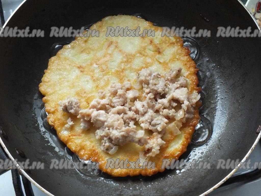 Накройте фарш свободной частью блинчика, прижмите слегка лопаткой и обжаривайте с каждой стороны по 3-4 минуты под крышкой.
