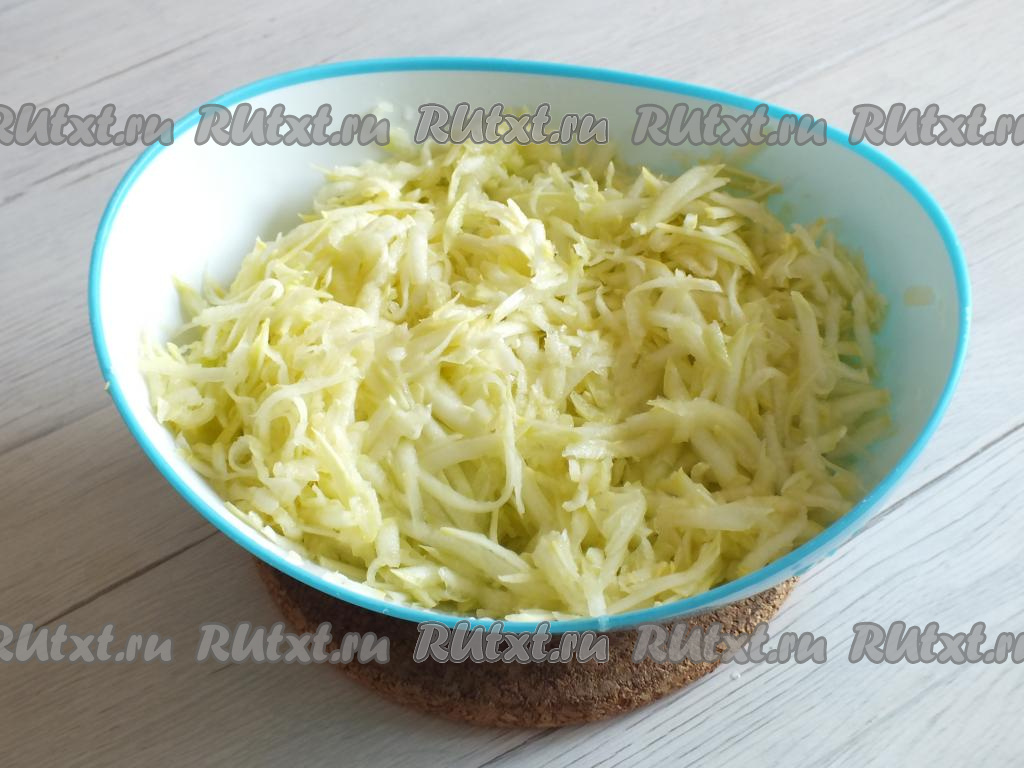 Очищенные кабачки натрите на крупной тёрке. Отожмите лишнюю жидкость.