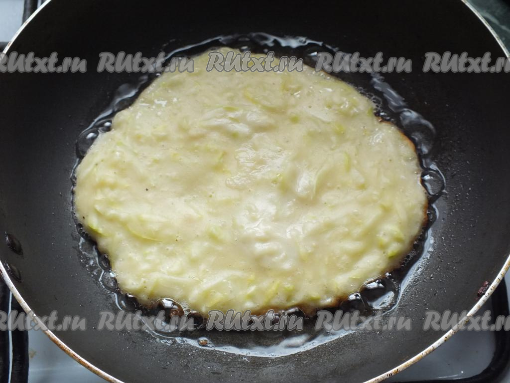 Возьмите сковороду с толстым дном (или антипригарным покрытием). Налейте пару столовых ложек растительного масла, разогрейте. Уменьшите огонь. Выложите на разогретую сковороду 3-4 столовых ложки кабачкового теста. Быстро распределите ложкой тесто по сковороде. Накройте сковороду крышкой и жарьте в течение 4 минут.