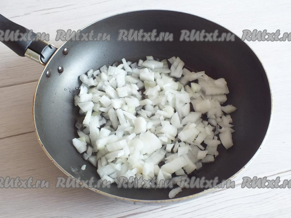 Репчатый лук очистите, нарежьте на мелкие кубики и обжарьте до мягкости на сковороде на среднем огне с добавлением 2 столовых ложек растительного масла (на это уйдёт минут 5).