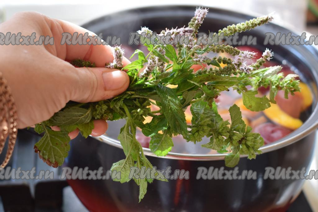 Мяту, если добавляете, растираем руками между ладонями и кладём в компот из персиков и слив, даём закипеть и выключаем огонь. Кипящий компот можно разлить по простерилизованным банкам, закатать, дать баночкам полностью остыть, а затем убрать на хранение до зимы. Если же вы приготовили компот, чтобы пить его свежесваренным, тогда, сняв кастрюлю с огня, даём напитку настояться до тех пор, пока все фрукты не опустятся на дно кастрюли.